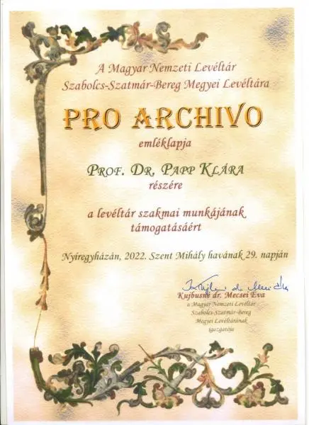 Papp Klára professzor asszony Pro Archivo emléklapot kapott, ahogy Bene János (a képen bal oldalt), a nyíregyházi Jósa András Múzeum korábbi igazgatója is. Középen Barabás László, akinek odaítélték a Balogh István érmet.