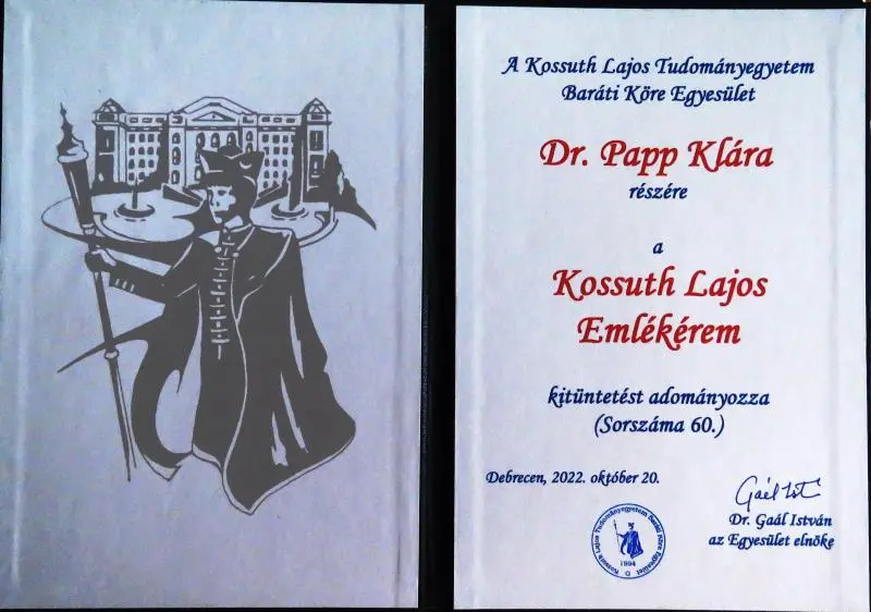 A Kossuth Lajos Tudományegyetem Baráti Köre Egyesület a Kossuth Lajos Emlékérmet idén Prof. Dr. Papp Klárának ítélte, aki a díjat tudományos és egyetemi tevékenységéért, különösen a Bölcsészettudományi Kar dékánjaként végzett munkájáért vehette át.